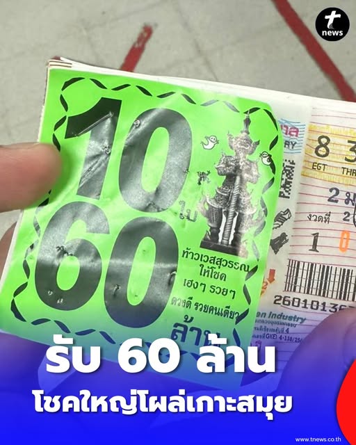 โชคใหญ่โผล่เกาะสมุย รางวัลที่ 1 แตก 10 ใบ รับ 60 ล้าน ตร.ถือยังมือสั่น