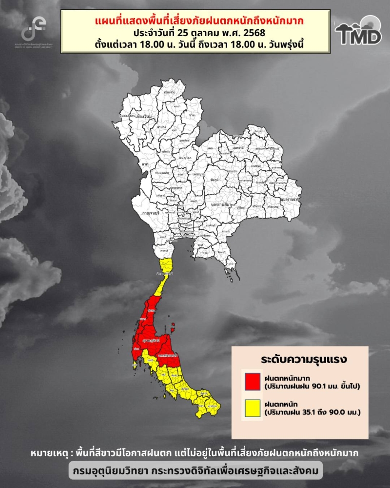 วันที่ 25 ตุลาคม 2568 กรมอุตุนิยมวิทยา พยากรณ์อากาศ 24 ชั่วโมงข้างหน้า ภาคใต้ตอนกลางถึงตอนล่างมีฝนตกหนักถึงหนักมากบางแห่ง ขอให้ประชาชนในบริเวณดังกล่าว โดยเฉพาะบริเวณจังหวัดประจวบคีรีขันธ์ ชุมพร สุราษฎร์ธานี นครศรีธรรมราช ระนอง พังงา ภูเก็ต และกระบี่ ระวังอันตรายจากฝนฟ้าคะนอง ฝนตกหนักถึงหนักมากและฝนที่ตกสะสม รวมทั้งเพิ่มความระมัดระวังในการสัญจรผ่านบริเวณที่มีน้ำท่วมขัง เนื่องจากร่องมรสุมกำลังค่อนข้างแรงพาดผ่านภาคใต้ตอนล่าง ประกอบกับมรสุมตะวันออกเฉียงเหนือกำลัง ปานกลางพัดปกคลุมอ่าวไทยตอนบน ภาคใต้ตอนบน และทะเลอันดามันตอนบน